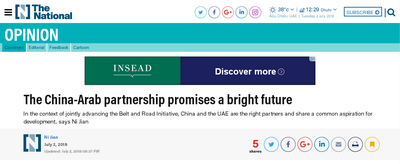 中阿合作論壇第八屆部長級會議將于2018年7月10日在北京舉行。近日,駐阿聯酋大使倪堅在阿聯酋《國民報》、《聯邦報》等英文、阿文主流媒體上發表題為《絲路結伴 風雨同行 共奏中阿友好新樂章》的署名文章。全文如下: